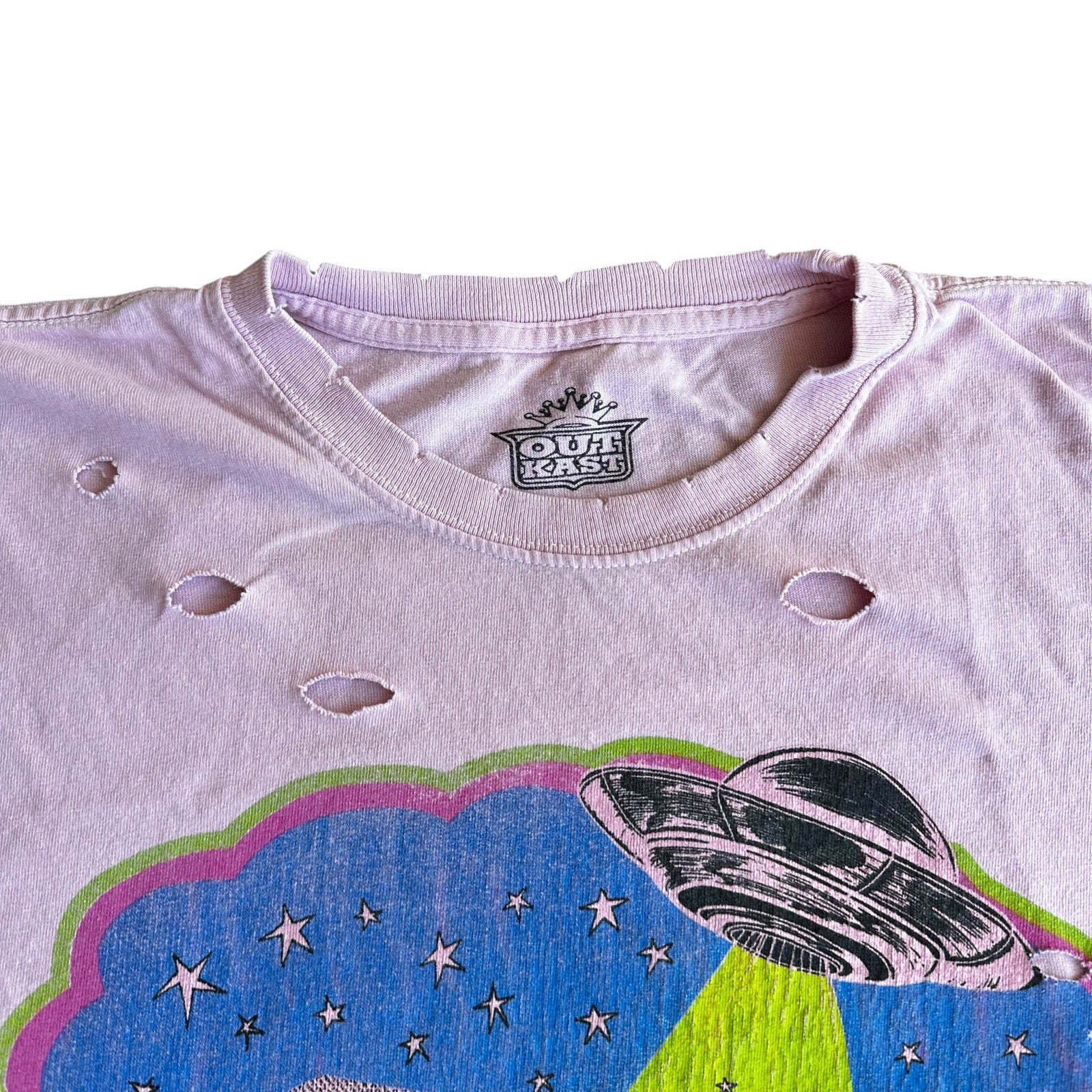 - pink distressed colorway with front graphic print of Andre 3000 and Big Boi